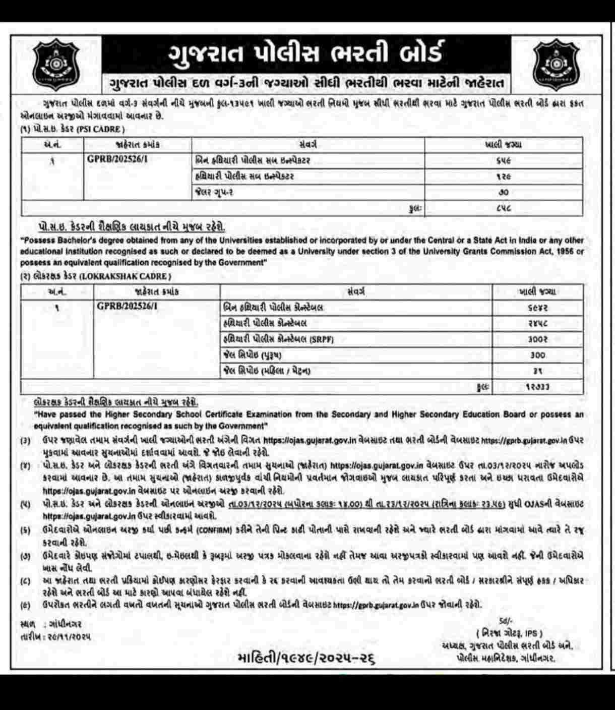 - જાહેરાત માં દર્શાવવામાં મુજબ Gujarat Police Bharti 2025 બે મુખ્ય કેટેગરી હેઠળ ભરતી કરવામાં આવશે: