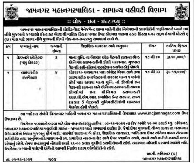 જ. જાહેરાત Jamnagar Municipal Corporation Bharti 2025 માં 10/12 પાસ અને 1 વર્ષનો Govt. Approved Live stock Inspector Course અથવા Veterinary/ Animal Husbandry Diploma Course જોવો જોઈએ.