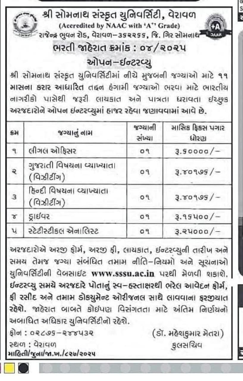SSSU Veraval ભરતી 2025માં લિગલ ઓફિસર, ગુજરાતી વ્યાખ્યાતા (વિઝિટિંગ), હિન્દી વ્યાખ્યાતા (વિઝિટિંગ), ડ્રાઈવર, અને સ્ટેટિસ્ટિકલ એનાલિસ્ટ જેવી કુલ 5 જગ્યાઓ માટે ભરતી જાહેર થઈ છે.