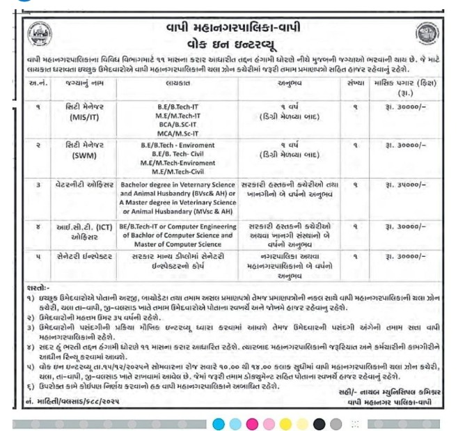 - Vapi Nagarpalika Bharti 2025 વાપી મહાનગરપાલિકા ભરતી 2025 | WMC Walk-In-Interview | વિવિધ જગ્યાઓ પર ભરતી 2025 અંતર્ગત MIS/IT મેનેજર, SWM મેનેજર, વેટરનેરી ઓફિસર, ICT ઓફિસર અને સેનિટરી ઇન્સ્પેક્ટર સહિતની વિવિધ જગ્યાઓ માટે વોક-ઇન ઇન્ટરવ્યૂ જાહેર. લાયકાત, પગાર, ઇન્ટરવ્યૂ તારીખ, એડ્રેસ અને જરૂરી દસ્તાવેજોની સંપૂર્ણ માહિતી અહીં વાંચો.